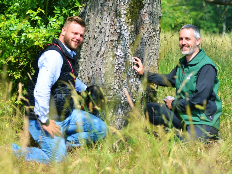 Betriebsleiter der Fürstlich Löwenstein’schen Forstverwaltung Florian Pfeuffer und Julian Bruhn an einem der alten Birnbäume (Foto: Jennifer Weidle)