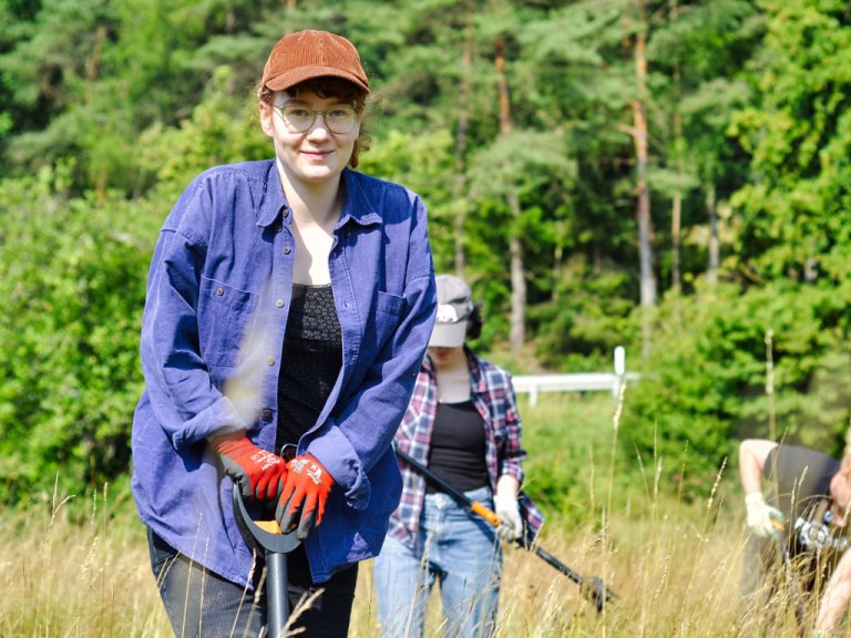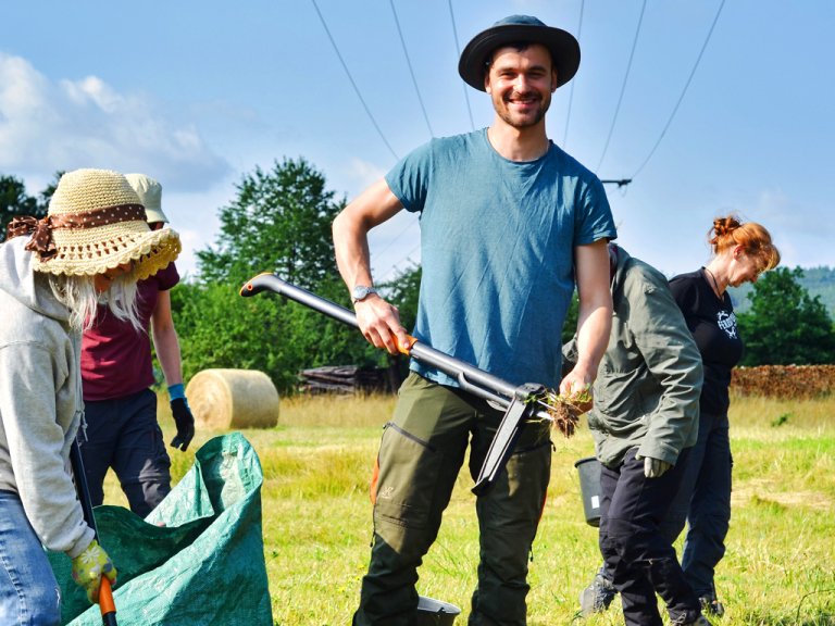 So zum Beispiel Anke (54), die aus der Nähe von Hannover angereist ist und normalerweise im Büro sitzt. Sie sei gerne draußen und beschäftige sich in ihrer Freizeit mit Heilkräutern. „Ich bin hier, um unsere Wiesen zu schützen“, sagt die Speditionskauffrau. Auch Angelo (46) – im echten Leben Grafik-Designer – aus Bremen arbeitet gerne im Freien und verbindet sein Engagement für die Natur mit dem Reisen. Ann-Kathrin (34) ist das erste Mal dabei. Die Konditorin aus Tübingen genießt es, beim Bergwaldprojekt Gleichgesinnte zu treffen.