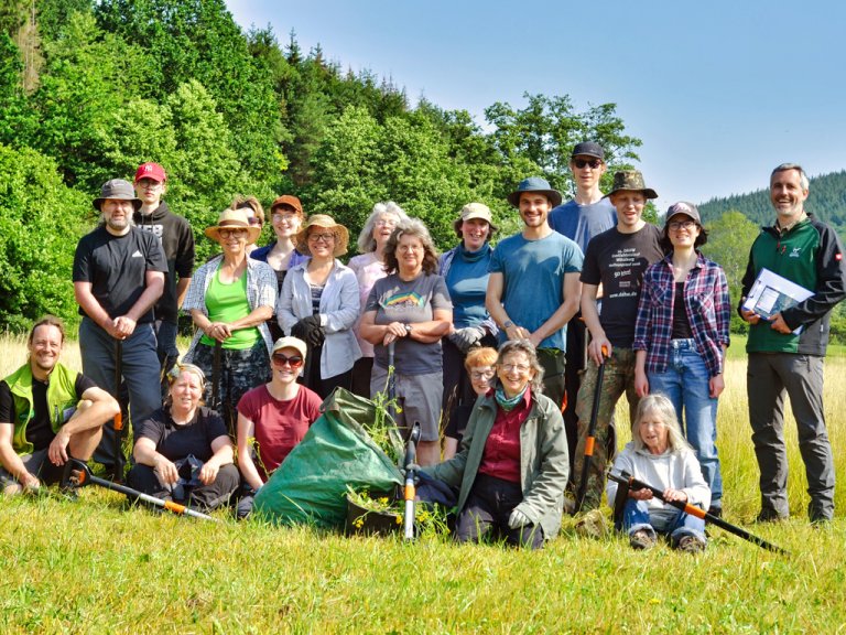 Ausgerüstet mit professionellen Ausstechern marschierte das Team vom Bergwaldprojekt über die Wiesen des Sinngrunds. Die Teilnehmerinnen und Teilnehmer reisten aus verschiedenen Teilen Deutschlands an, um bei der Aktion mitzuwirken. Dabei arbeiten sie ehrenamtlich und nehmen sich frei von Alltag und regulärer Arbeit.