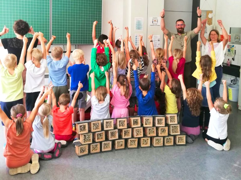 Nach der Theorie durfte jedes Kind ein eigenes Wildbienenhotel bauen; richtige Kunstwerke wurden daraus. Zum großen Finale ging es in den Schulgarten zum Bienenstreicheln.