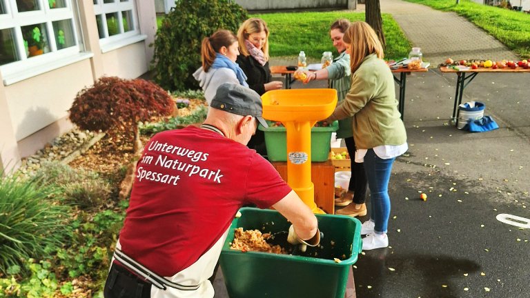 Beim Pressen von Apfelmost vermittelte der Naturpark Spessart altes Wissen (Foto: Felix Kühne)