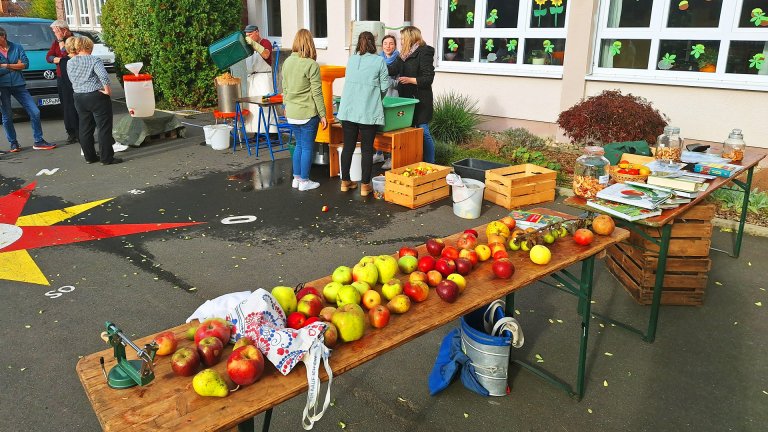 Besonderes Highlight der Veranstaltung war der praktische Teil: ein „Crashkurs“ im Apfelmostkeltern. Hier durften die Lehrkräfte selbst Hand anlegen: Obst waschen, zerkleinern und in einer Saftpresse frischen Apfelmost herstellen. Zum Abschluss der Fortbildung genossen alle Teilnehmenden ein Glas des Mostes – ein rundum gelungener Abschluss eines lehrreichen Tages.