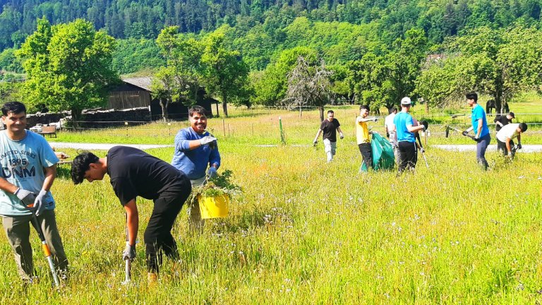 40 Personen waren der Einladung zur Beseitigung der Giftpflanzen gefolgt. Damit war die Gruppe rund doppelt so groß wie in den Vorjahren. Der Grund: 25 Geflüchtete aus Afghanistan, Tunesien und dem Iran waren beim Einsatz dabei.