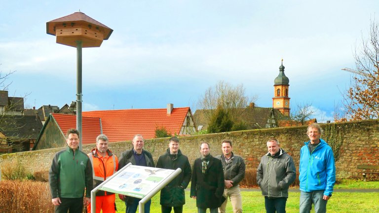 Vor dem ersten Mauerseglertum in Main-Spessart: Oliver Kaiser, Sascha Weigl (Bauhofleiter), Bernd Wetzel (Bürgermeister), Daniel Müller (Leiter Servicebank Raiffeisenbank Mönchberg), Holger Jalowitzki (Filialdirektor der Sparkasse Eschau), Thomas Staudt (Umweltbeauftragter Gemeinde Mönchberg), Sigmund Geiger (Bauamt Gemeinde Mönchberg) und Ulrich Müller (Untere Naturschutzbehörde LRA Miltenberg)
