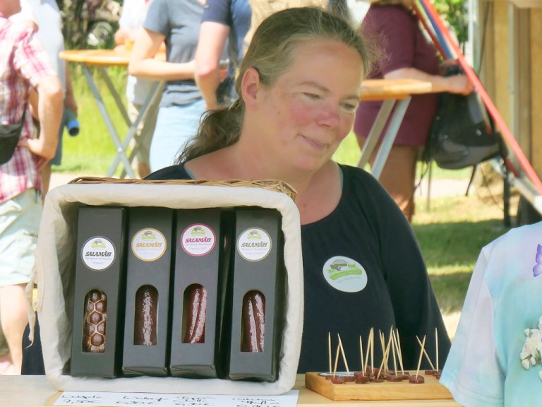 „Es ist schön“, so ergänzt Christiane Geiger, Schäferin aus Gemünden-Adelsberg, „dass die komplette Verarbeitung in der Region stattfindet.“ Die SALAMÄH sei prima für eine Brotzeit beim Wandern im Spessart und „ein leckeres Mitbringsel für Zuhause“, sagt sie.