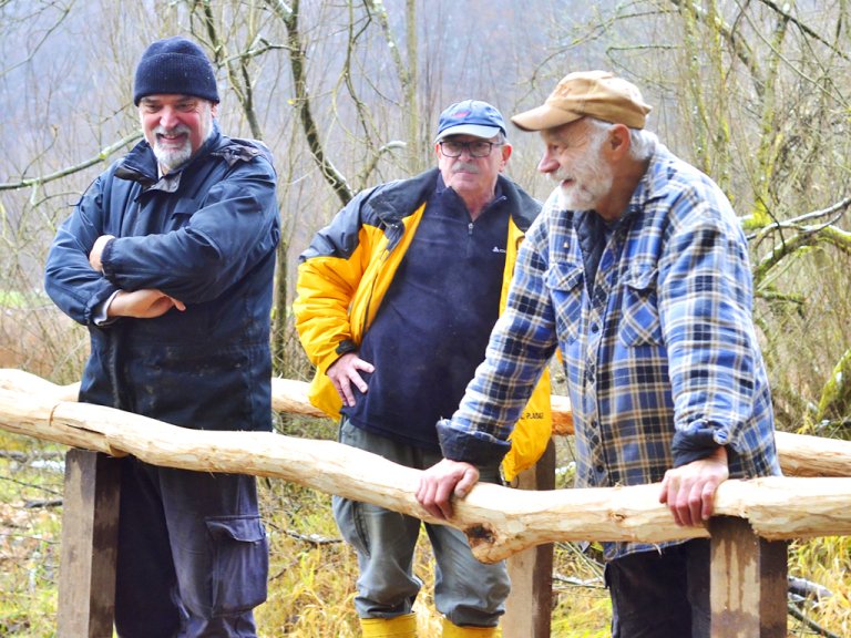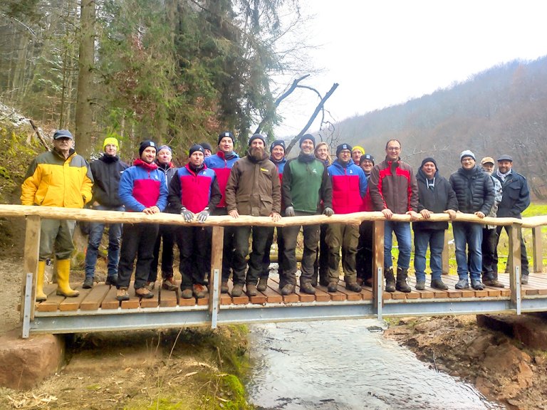 Julian Bruhn, stellvertretender Geschäftsführer des Naturparks Spessart ist zufrieden: „Den kompletten Tag haben wir hier gearbeitet. Ohne so viele Freiwillige hätten wir das nicht geschafft.“ Der BUND Naturschutz in Bayern (BN) fertigte das Geländer von Hand und brachte die von den Bayerischen Staatsforsten spendierten Douglasien-Bohlen auf der Brücke an.