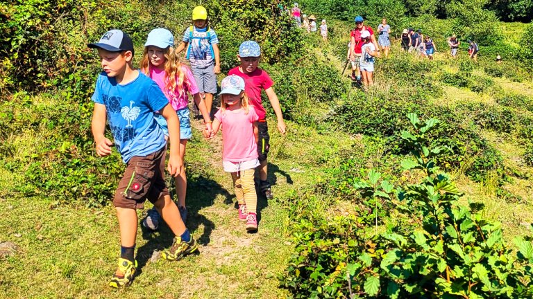 Naturerlebnisse zum Anfassen gab es reichlich: Die Kinder reichten eine gefundene Blindschleiche im Glas herum und naschten reife Brombeeren. Die wildpferdeartigen Exmoor-Ponys ließen sich streicheln, die stattlichen Wasserbüffel über den sicheren Zaun hinweg füttern.