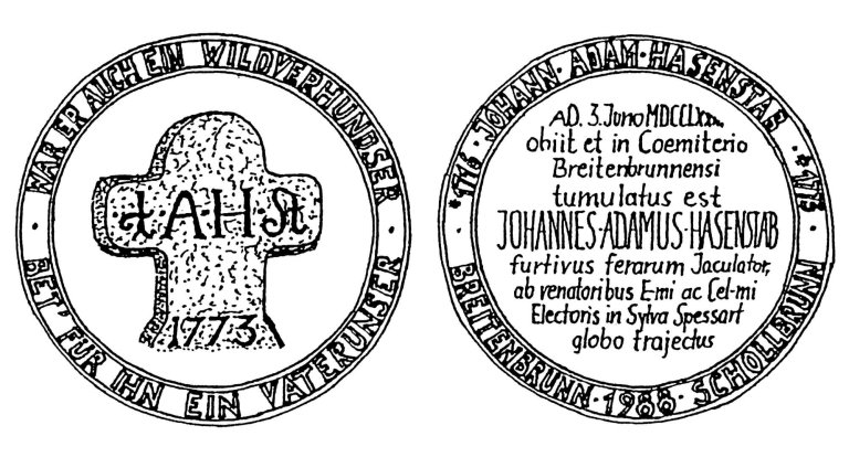 Der berühmteste Wilderer des Spessarts ist Johann Adam Hasenstab. 1716 in Rothenbuch als Sohn eines Holzknechts geboren, verdingte er sich schon in jungen Jahren als Mainzer Jagdgehilfe; seinen kargen Lohn bessert er mit Wilddiebstahl auf. Als sein Nebenerwerb aufflog, verließ er den Dienst der Kurmainzer und tauchte unter. Als Wilderer lebte Hasenstab jahrelang im Spessart und Taubertal, wo er seine Jagdbeute auf Märkten oder sogar an Pfarrer verkaufte. Er gab sich u.a. als Heilkundiger aus und wechselte sehr oft seinen Aufenthaltsort. 1749 erklärte ihn der Mainzer Hofrat als vogelfrei und setzte ein Kopfgeld von 30 Reichstalern aus. Um 1750 wurde Hasenstab angeschossen, gefasst und verurteilt. Als Strafgefangener arbeitet er vermutlich bis 1757 am Festungsbau in Mainz. Danach kehrte er in den Spessart zurück, wo er vom Volk unterstützt die Wilderei wieder aufnahm. Um 1770 wurde er erneut gefangen genommen und auf Lebenszeit verbannt, tauchte jedoch zwei Jahre später wieder im Spessart auf. Am 3. Juni 1773 erschoss ihn Johann Sator, ein kurmainzischer Revierjäger im Kropfbachtal bei Schollbrunn; Sator erhielt dafür „15 Gulden Schuss- und Fanggeld“. An der Todesstelle steht heute ein Gedenkkreuz aus Sandstein mit den Initialen J A H St und der Jahreszahl 1773. Begraben wurde der „Erzwilddieb“ des Spessarts auf dem Friedhof in Breitenbrunn.