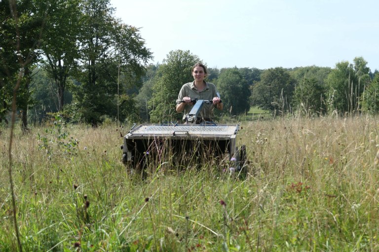 Zentraler Baustein im Projekt ist der sogenannte „eBeetle 2.0“. Das aus der Schweiz stammende Gerät sieht aus wie eine Mischung aus Fahrradanhänger und Kehrmaschine. Mit seinen rotierenden Bürsten sammelt der eBeetle reife Samen von Wiesenpflanzen ein, ohne dabei die Pflanzen abzuschneiden. Gebietsheimisches Saatgut mit gebietstypischen Artenkombinationen kann so direkt im Naturpark Spessart gewonnen werden. Als Spenderflächen werden besonders blüten- und artenreiche Wiesen genutzt - oder solche mit besonders wertvollen Pflanzenarten. Teilweise erfolgen auch ergänzende Handsammlungen einzelner Arten. Das Saatgut wird auf vorbereiteten Ansaatflächen ausgebracht. Dies können z.B. entbuschte Wiesenbrachen sein oder sehr artenarmen Wiesen, die ökologisch aufgewertet werden sollen.