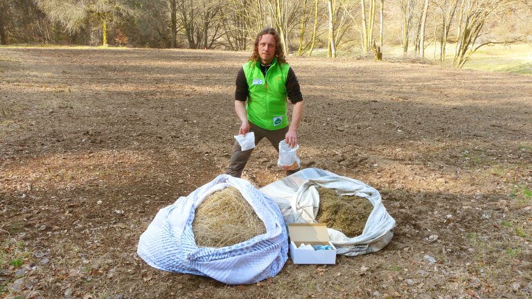 Das Projektmanagement erfolgt durch die Gebietsbetreuer für Grünland. Bei der Umsetzung unterstützen die Naturpark-Ranger:innen. Mit der oft sehr aufwendigen Vorbereitung der Ansaatflächen (Entbuschung, Entsteinung, Anlage eines mähbaren Reliefs) werden Landwirt:innen oder geeignete Unternehmen beauftragt. Genauso wichtig wie die Wiesenanlage ist die Folgepflege bzw. Folgenutzung der Wiesen- oder Weideflächen. Auch diese wird von uns betreut und geeignete Vertragsnaturschutzprogramme vermittelt. Bis sich eine stabile Pflanzengemeinschaft eingestellt hat, dauert in der Regel mindestens 5 Jahre.